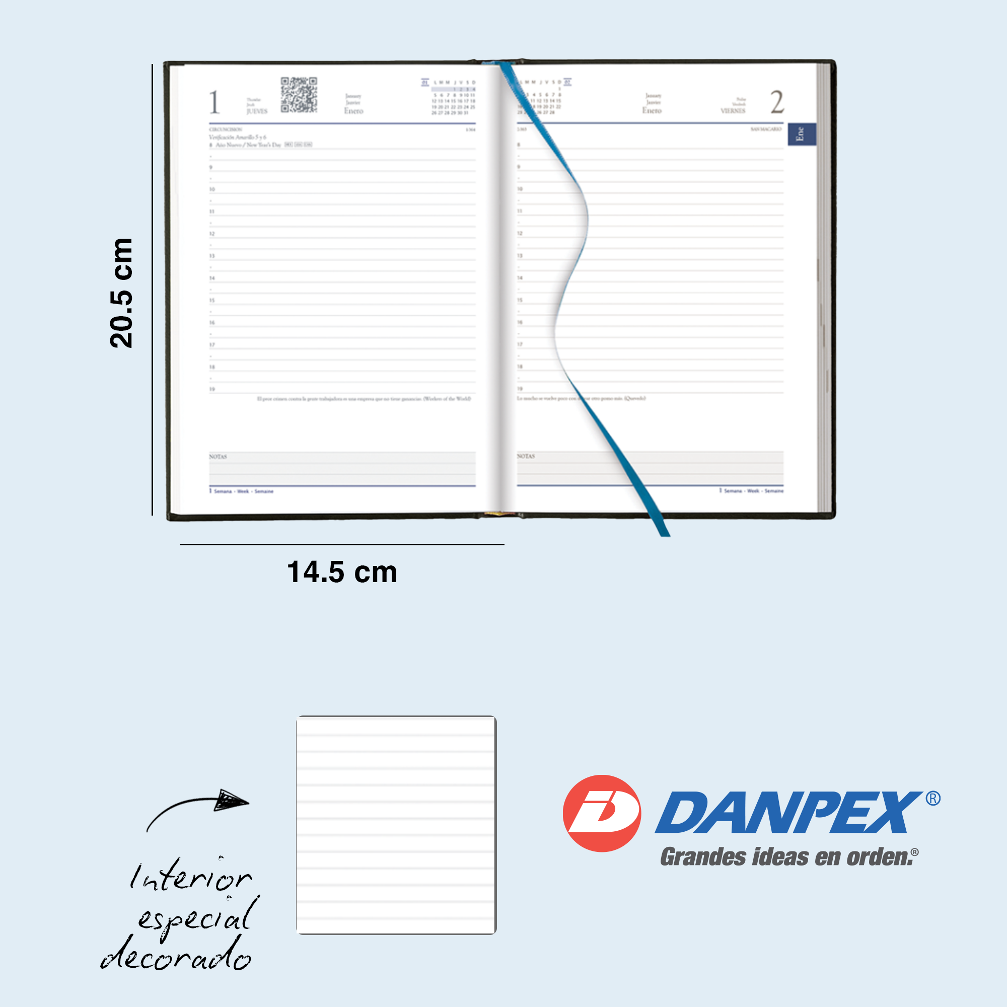 Su formato diario te brinda el espacio ideal para planear citas, pendientes y objetivos, permitiéndote llevar un control claro de tus actividades. El papel blanco de alta calidad garantiza una escritura cómoda y sin traspasos, compatible con plumas, lápices y marcadores.